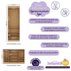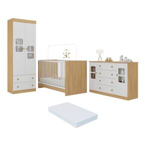 Diferenciais: - Conjunto produzido em MDP/MDF (12/15mm) de reflorestamento com acabamento acetinado (cerca de 20% de brilho): sustentabilidade e durabilidade. - Berço 3 em 1 que se transforma em sofá e minicama, acompanhando o crescimento do bebê. - Lastro em madeira com 3 regulagens de altura e suporte para mosquiteiro para noites mais tranquilas e protegidas. - Berço certificado pelo INMETRO (Selo n 000332/2025). - Colchão D18 incluso: possui tratamento antiácaro, antialérgico, antimofo e um dos lados impermeável. - Frentes (guarda-roupa e cômoda) produzidas em MDF. - Guarda-roupa com 2 portas e 2 gavetas: amplo espaço para organizar roupinhas e acessórios. - Cômoda com 2 portas e 4 gavetas. - Detalhes de vidro incolor temperado 3mm nas portas: toque charmoso que permite visualizar o interior dos móveis. - Corrediças telescópicas: abertura total e silenciosa das gavetas. - Cabideiro em alumínio: permite acomodar roupas longas e curtas para que não amassem. - Puxadores em ABS delicados e práticos. - Rodapés: visual elegante para o guarda-roupa e a cômoda. - Sistema antitombamento no guarda-roupa e cômoda: proporciona segurança para o bebê e tranquilidade aos pais.