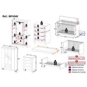 Conteúdo da Embalagem: 1 (um) Berço 1 (um) Colchão 1 (um) Guarda-roupa 1 (uma) Cômoda Manual de Montagem Kit Ferragem