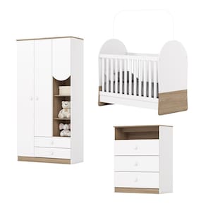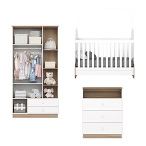 "Esse conjunto é composto pelo Berço, Cômoda e Guarda Roupas Magia: Diferenciais do Berço Magia: - É 3 em 1, pode ser utilizado com Berço, Berço-cama e Mini-Cama; - Possui duas Regulagens do estrado, uma mais alta para os primeiros dias ou até o bebê se virar, e outra para as próximas fases. - Acabamento das extremidades com perfil PVC flexível, que suaviza as bordas e evita danos com batidas de canto; - Estrados com bordas arredondadas, e 100% pitado em PU. Diferenciais da Cômoda e Guarda Roupas: - Corrediças telescópicas com deslizar mais suave, com menos barulho e mais duráveis; - Puxador em ABS Reforçado; - Tampo da Cômoda e Chapéu do Guarda Roupas com Acabamento em Soft; - Guarda Roupas com detalhe usinado. - Design Moderno e Cor amadeirada exclusiva;" Acabamento da Gaveta: Pintura Texturizada UV Acabamento da Porta: Pintura Texturizada UV Acompanha Manual de Instalação: Sim Acompanha Suporte para Mosquiteiro: Sim - Sem Véu Altura do Conjunto: 180,5 cm Ambiente Principal: Quarto de Bebê Certificado: 016 817/2024 Certificado INMETRO (código): 016 817/2024 codigo_ean: 7900288169907 Complexidade da Montagem: Alta: deve ser montado por um montador especializado Cor: Branco/Jequitibá Cor do Produto: Branco/Jequitibá Cor Interna: Trama Branco Escala de Brilho: Fosco Escala de Brilho da Gaveta: Brilhante Escala de Brilho da Porta: Brilhante Escala de Brilho da Prateleira: Fosco Estampado: Não Estrado com Regulagem de Altura: Sim Estrado Regulável em Quantas Posições: 02 Informações Complementares: É importante fixar a cômoda e o Guarda Roupas na parede para evitar tombamento, peças para fixação estão inclusas. Largura do Conjunto: 132,5 cm Linha ou Coleção: Magia Manual de Montagem e Instalação: https://product-hub-prd.madeiramadeira.com.br/725865488/documents/397dd5c7-0913-46a6-a9f3-ec1e32a287c92985185307517494748849549.pdf Marca: Henn Material da Gaveta: MDF/MDP Material da Porta: MDP Material da Prateleira: MDP Material do Estrado: MDF Material do Fundo: MDF Material do Puxador da Gaveta: ABS Material do Puxador da Porta: ABS Material Principal: MDP Medida de Cada Item: Berço: (AxLxP) 110cm X 132,5cm X 68,5cm, Cômoda: (AxLxP) 94,5cm X 75cm X 41cm, Guarda-Roupas: (AxLxP) 180,5cm X 92cm X 41cm modular: Não Montagem Flex: Berço Pode ser covertido em Berço-Cama e Mini-Cama Necessita Montagem: Sim Origem do Produto: Nacional Permite a Utilização de Cama Auxiliar: Não Peso: 109.0000 Peso de Cada Item: Berço: 31kg: Cômoda: 26kg Guarda-Roupas: 52kg Pintura Atóxica: Sim Porta Janelada: Não Possui Capitonê: Não Possui Certificado: Sim Possui Espelhos: Não Possui Gavetas: Sim Possui Grade: Sim Possui Portas: Sim Possui Prateleiras: Sim Possui Rodízio: Não Possui Trocador: Não Profundidade do Conjunto: 68,5 cm Quantidade de Gavetas: 05 Quantidade de Portas: 03 Quantidade de Prateleiras: 06 Recomendações de Uso, Manutenção e Limpeza: Para limpeza de seu móvel, use uma flanela seca ou umedecida. Não utilize produtos químicos que possam danificar o produto. Sistema de Montagem: Parafusos e Cavilhas Tipo de Corrediça da Gaveta: Metálica Telescópica Tipo de Dobradiça/Corrediça da Porta: Metálica Tipo de Grade: Fixa Tipo de Guarda-Roupa: Infantil Tipo de Porta: Bater Tipo de Puxador da Gaveta: Externo Tipo de Puxador da Porta: Externo