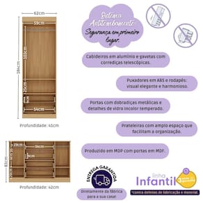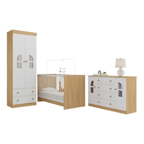 Diferenciais: - 3 anos de garantia contra defeitos de fabricação e material. - Conjunto produzido em madeira de reflorestamento (MDP/MDF 12/15mm) com acabamento acetinado (cerca de 20% de brilho): sustentabilidade e durabilidade. - Berço 3 em 1 que se transforma em sofá e minicama, acompanhando o crescimento do bebê. - Lastro em madeira com 3 regulagens de altura e suporte para mosquiteiro para noites mais tranquilas e protegidas. - Berço certificado pelo INMETRO (Selo n 000332/2025). - Padrão nacional (tamanho do colchão indicado: 130x60cm). Colchão não incluso. - Frentes (guarda-roupa e cômoda) produzidas em MDF. - Guarda-roupa com 2 portas e 2 gavetas: amplo espaço para organizar roupinhas e acessórios. - Cômoda com 2 portas e 4 gavetas. - Detalhes de vidro incolor temperado 3mm nas portas: toque charmoso que permite visualizar o interior dos móveis. - Corrediças telescópicas: abertura total e silenciosa das gavetas. - Cabideiro em alumínio: permite acomodar roupas longas e curtas para que não amassem. - Puxadores em ABS delicados e práticos. - Rodapés: visual elegante para o guarda-roupa e a cômoda. - Sistema antitombamento no guarda-roupa e cômoda: proporciona segurança para o bebê e tranquilidade aos pais.