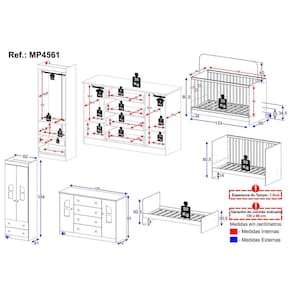 Conteúdo da Embalagem: 1 (um) Berço 1 (um) Guarda-roupa 1 (uma) Cômoda Manual de Montagem Kit Ferragem