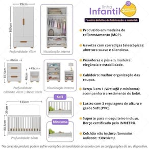- Berço 3 em 1 versátil: transforma-se em sofá e minicama, acompanhando o crescimento da criança.