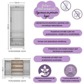 - Sistema antitombamento no guarda-roupa e cômoda: proporciona segurança para o bebê e tranquilidade aos pais.