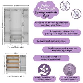 Diferenciais: - 3 anos de garantia contra defeitos de fabricação e material (exceto colchão). - Conjunto produzido em madeira de reflorestamento (MDP 12/15mm) com acabamento acetinado (cerca de 20% de brilho): sustentabilidade e durabilidade. - Berço 3 em 1 que se transforma em sofá e minicama, acompanhando o crescimento do bebê. - Lastro em madeira com 3 regulagens de altura e suporte para mosquiteiro para noites mais tranquilas e protegidas. - Berço certificado pelo INMETRO (Selo n 0000085/2018). - Padrão americano (tamanho do colchão: 130x70cm). - Colchão D18 incluso: possui tratamento antiácaro, antialérgico, antimofo e um dos lados impermeável. - Grade Soft (PVC): ecologicamente correta, com matéria-prima livre de metais pesados, atóxica e com proteção antiamarelamento. - Guarda-roupa com 4 portas e 2 gavetas: amplo espaço para organizar roupinhas e acessórios. - Cômoda com 1 porta e 4 gavetas. - Corrediças telescópicas: abertura total e silenciosa das gavetas. - Cabideiro em alumínio: permite acomodar roupas longas e curtas para que não amassem. - Puxadores em ABS delicados e práticos. - Pés em polipropileno e rodapés usinados em MDF: visual elegante e estabilidade para o guarda-roupa e a cômoda. - Sistema antitombamento no guarda-roupa e cômoda: proporciona segurança para o bebê e tranquilidade aos pais.