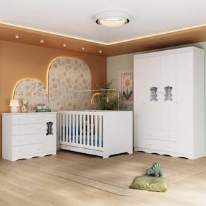 Diferenciais: - 3 anos de garantia contra defeitos de fabricação e material. - Conjunto produzido em madeira de reflorestamento (MDP 12/15mm) com acabamento acetinado (cerca de 20% de brilho): sustentabilidade e durabilidade. - Berço 3 em 1 que se transforma em sofá e minicama, acompanhando o crescimento do bebê. - Lastro em madeira com 3 regulagens de altura e suporte para mosquiteiro para noites mais tranquilas e protegidas. - Grade Soft (PVC): ecologicamente correta, com matéria-prima livre de metais pesados, atóxica e com proteção antiamarelamento. - Berço certificado pelo INMETRO (Selo n 0000085/2018). - Padrão americano (tamanho do colchão indicado: 130x70cm). Colchão não incluso. - Guarda-roupa com 4 portas e 2 gavetas: amplo espaço para organizar roupinhas e acessórios. - Cômoda com 1 porta e 4 gavetas. - Portas e gavetas produzidas em MDF. - Detalhes de vidro incolor temperado 3mm nas portas: toque charmoso que permite visualizar o interior dos móveis. - Corrediças telescópicas: abertura total e silenciosa das gavetas. - Cabideiro em alumínio: permite acomodar roupas longas e curtas para que não amassem. - Puxadores em ABS delicados e práticos. - Rodapés usinados em MDF: visual elegante para o guarda-roupa e a cômoda. - Sistema antitombamento no guarda-roupa e cômoda: proporciona segurança para o bebê e tranquilidade aos pais.