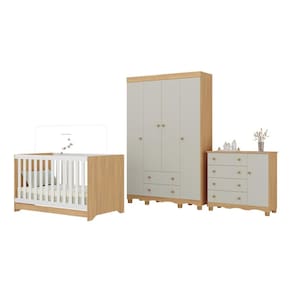 Diferenciais: - 3 anos de garantia contra defeitos de fabricação e material. - Conjunto produzido em madeira de reflorestamento (MDP 12/15mm) com acabamento acetinado (cerca de 20% de brilho): sustentabilidade e durabilidade. - Berço 3 em 1 que se transforma em sofá e minicama, acompanhando o crescimento do bebê. - Lastro em madeira com 3 regulagens de altura e suporte para mosquiteiro para noites mais tranquilas e protegidas. - Berço certificado pelo INMETRO (Selo n 0000085/2018). - Padrão americano (tamanho do colchão indicado: 130x70cm). Colchão não incluso. - Grade Soft (PVC): ecologicamente correta, com matéria-prima livre de metais pesados, atóxica e com proteção antiamarelamento. - Guarda-roupa com 4 portas e 2 gavetas: amplo espaço para organizar roupinhas e acessórios. - Cômoda com 1 porta e 4 gavetas. - Corrediças telescópicas: abertura total e silenciosa das gavetas. - Cabideiro em alumínio: permite acomodar roupas longas e curtas para que não amassem. - Puxadores em ABS delicados e práticos. - Pés em polipropileno e rodapés usinados em MDF: visual elegante e estabilidade para o guarda-roupa e a cômoda. - Sistema antitombamento no guarda-roupa e cômoda: proporciona segurança para o bebê e tranquilidade aos pais.