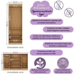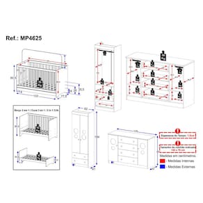 Dimensões do Produto Montado: Berço - Altura: 80,5cm | Largura: 133cm | Profundidade: 77,5cm Guarda-roupa - Altura: 184cm | Largura: 62cm | Profundidade: 41cm Cômoda - Altura: 83cm | Largura: 125cm | Profundidade: 42cm *Você pode consultar as medidas detalhadas na imagem técnica do produto.