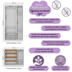 Dimensões do Produto Montado: Berço - Altura: 80,5cm | Largura: 133cm | Profundidade: 77,5cm Guarda-roupa - Altura: 184cm | Largura: 92cm | Profundidade: 41cm Cômoda - Altura: 83cm | Largura: 95cm | Profundidade: 42cm *Você pode consultar as medidas detalhadas na imagem técnica do produto.