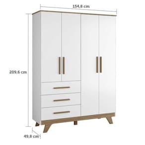 O Guarda Roupa da linha Retrô 4 Portas possui cabideiro metálico, puxadores em MDF revestidos, corrediça telescópica, modelo de portas lisa. Disponível nas cores Branco Brilho e Branco Brilho/Carvalho.