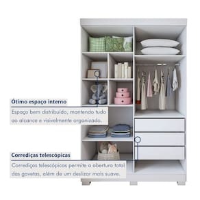 Máxima Organização: São 7 gavetas com corrediças telescópicas e 7 prateleiras, oferecendo amplo espaço para roupas, fraldas e enxoval.