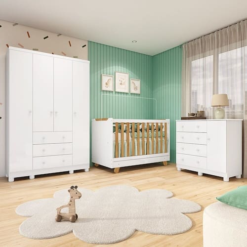 Crie um ambiente encantador e funcional com este quarto de bebê completo 100% MDF, desenvolvido para oferecer segurança, conforto e estilo. O berço certificado pelo INMETRO possui regulagem de altura e pode ser transformado em minicama, ou minisofá, ou escrivaninha, acompanhando o crescimento do bebê. O guarda-roupa e a cômoda possuem corrediças telescópicas que garantem abertura suave e durabilidade nas gavetas, cada também possui 1 cabideiro metálico para maximizar a organização da sua rotina. Com design clássico moderno e acabamento delicado, o conjunto traz um toque de leveza e elegância ao espaço infantil.