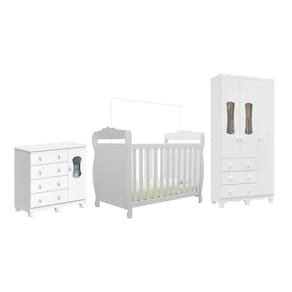 Qualidade, beleza, conforto e segurança para toda família na hora de montar o quartinho do(a) bebê. Produtos estrurados em 100% MDF e com acabamento em pintura UV atóxica. O berço possui padrão de colchão americano, estrado com altura regulável e todas as bordas arredondadas e laqueadas, que proporcionam uma sensação agradável ao toque, além de poder ser utilizado como minicama ou minisofá, prolongando seu uso. As gavetas deslizam suavemente por corrediças telescópicas, facilitando sua abertura, interno com prateleiras que são ideais para acomodar as peças com organização da sua preferência. Essa proposta é a queridinha do momento. Ambiente composto por: - 1 Guarda Roupas 3 Portas com Janelas 188,50 x 91,90 x 41,50 (A x L x P - cm) - 1 Cômoda 1 Porta 4 Gavetas 88 x 95,30 x 42,30 (A x L x P - cm) - 1 Berço Minicama 3 em 1 99 x 148 x 78,40 (A x L x P - cm)