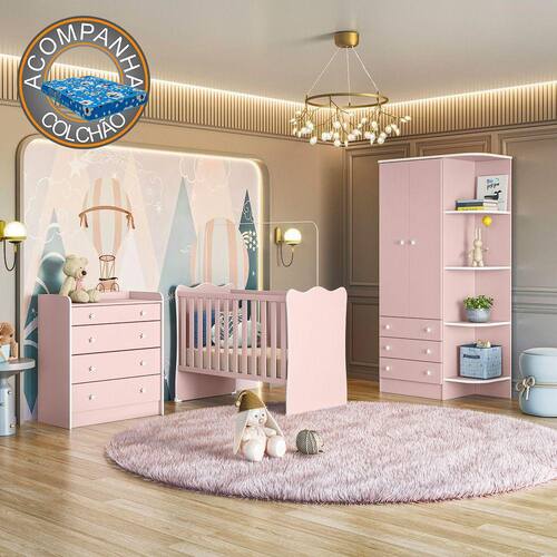 Características Estrutura em MDP Acabamento em pintura UV Acetinada Atóxica Grades de proteção fixas feitas em MDF Estrado em MDF com 3 opções de altura Acompanha suporte para mosquiteiro ACOMPANHA COLCHÃO 130 X 60 Suporta até 40 kg. 02 Portas articuladas 07 Gavetas externas Roupeiro com cantoneiras laterais acopladas Amplo espaço interno com prateleiras Cabideiro oblongo metálico Dobradiças e corrediças metálicas Puxadores em plástico poliestireno com formato de estrela Acabamento das bordas em perfil PVC Trocador embutido Obs.: Não acompanha almofada de trocador Sistema anti-tombamento para evitar riscos de acidentes.