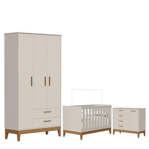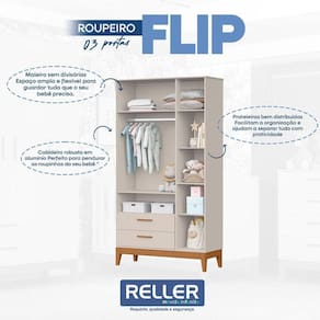 O Quarto de Bebê Flip da Reller é a escolha ideal para quem busca praticidade, beleza e conforto em um só conjunto. Com design moderno o kit com Roupeiro moderno é composto por um berço seguro e funcional, desenvolvido dentro das normas de qualidade, que garante noites tranquilas e acolhedoras. A Cômoda Sapateira oferece amplo espaço interno, equipada com corrediças telescópicas que proporcionam abertura suave, além de puxadores em MDF revestido e pés em madeira. Desenvolvido pela Reller com toda praticidade.