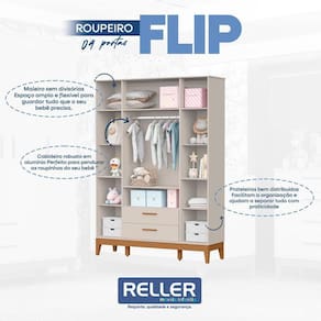 O Quarto de Bebê Flip da Reller é a escolha ideal para quem busca praticidade, beleza e conforto em um só conjunto. Com design moderno o kit com Roupeiro moderno é composto por um berço seguro e funcional, desenvolvido dentro das normas de qualidade, que garante noites tranquilas e acolhedoras. A Cômoda Gaveteiro oferece amplo espaço interno, equipada com corrediças telescópicas que proporcionam abertura suave, além de puxadores em MDF revestido e pés em madeira. Desenvolvido pela Reller com toda praticidade.