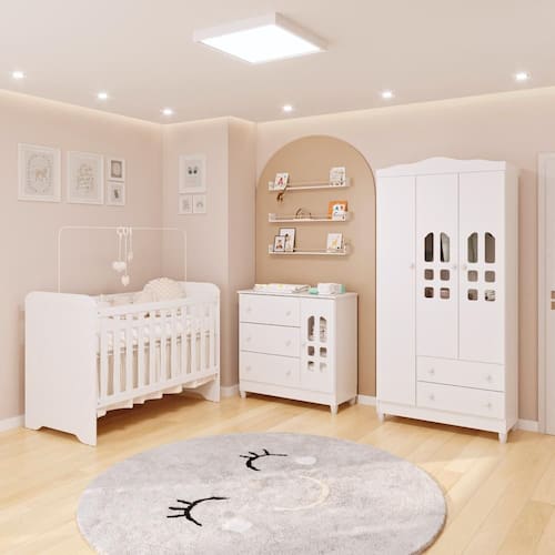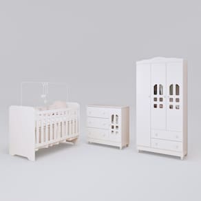 Três peças básicas para você começar a montar o quarto do seu bebê. O guarda-roupa traz toda praticidade e a divisão de espaço interna ideal para você organizar os pertences da criança. A cômoda fraldário tem um sistema exclusivo de travas anti-tombamento para garantir toda segurança na hora de trocar o seu baby. E o berço 3 em 1 pode ser aproveitado também como mini-cama e mini-sofazinho. Disponíveis nas cores Branco e Branco com Bétula.