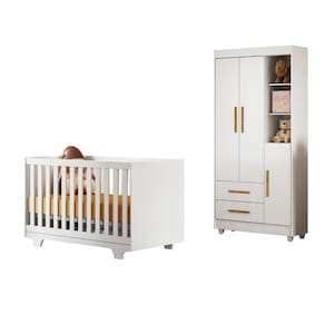 Quarto de Bebê Guarda Roupa 3 Portas e Berço Mini Cama 100% MDF Nina Branco. Esse lindo Conjunto de Quarto Infantil é tudo o que você pediu em um único ambiente. Toda essa combinação foi pensada para que este conjunto permaneça em sua casa por muitos anos, acompanhando o crescimento de seus pequenos. O Roupeiro Nina possui 3 portas e 2 Gavetas externas com corrediças telescópicas que permite um deslize mais seguro e suave, produzidos 100% em MDF. Excelente divisão interna, com cabideiro resistente para melhor organização das roupas. O Roupeiro Nina é flex, com dupla opção de cor, podendo ser todo Branco ou Branco/Amadeirado, ele é perfeito para tornar o ambiente do seu filho ainda mais lindo e aconchegante. Ean: 7909903361764