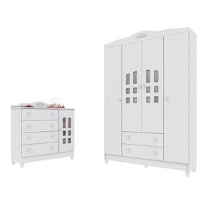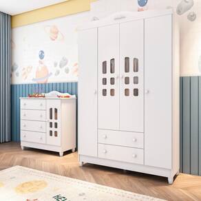 O dormitório perfeito para combinar com a decoração que você escolheu para acolher o seu baby. O guarda-roupa em que você tem ainda mais espaço para acomodar os pertences do seu bebê, de forma que as roupas não fiquem amassadas ou apertadas. Com cabideiro, prateleira e gavetas, as mamães podem organizar tudo de forma prática e funcional. Peça fabricada em 100% MDF de alta resistência mecânica, a cômoda é uma peça chave na organização de objetos, roupas e acessórios do bebê. O móvel tem um sistema de trava anti-tombamento e corrediça telescópicas nas gavetas. Este produto se encontra disponível na cor Branca.