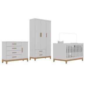 Um dormitório no estilo retrô para deixar o ambiente ainda mais encantador. Produzidos em 100% MDF de alta resistência mecânica e sua base e pés em madeira maciça. Esses móveis são todos rigidamente testados em laboratório e o Berço certificados pelo INMETRO. O berço multifuncional também serve como mini-cama e mini-sofá, o guarda-roupa e a cômoda contam com corrediças telescópicas em suas gavetas, trazendo mais e leveza às gavetas. Disponíveis nas cores Branco e Off White.