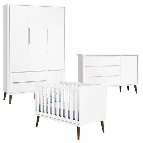 Quarto de Bebe Theo 3 Portas com Cômoda com Porta Branco Acetinado com Pés Amadeirado - Reller