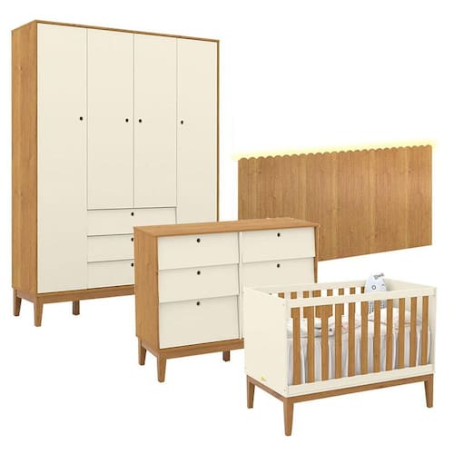 Quarto de Bebê Unique 4 Portas com Cômoda 6 Gavetas e Painel Farm com Led Off White Freijó Eco Wood - Matic