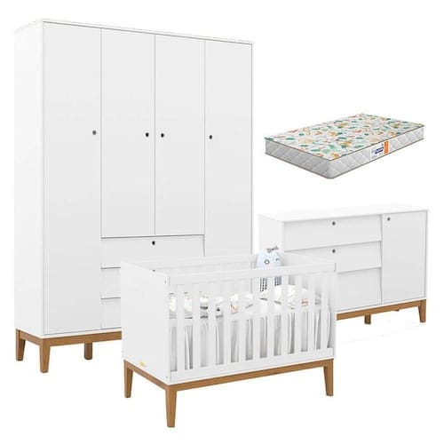 Quarto de Bebe Unique 4 Portas com Cômoda Sapateira Branco Soft Eco Wood e Colchão Gazin - Matic