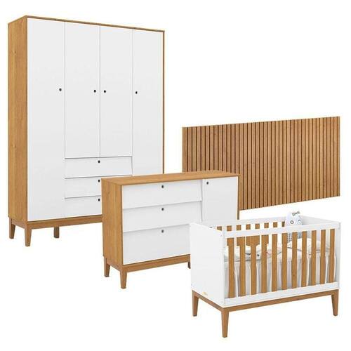 Quarto de Bebê Unique 4 Portas com Cômoda Sapateira e Painel Ripado Branco Soft Freijó Eco Wood - Matic