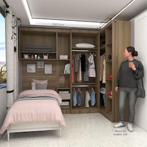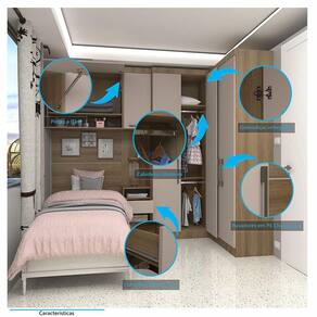 Informações Complementares: Dobradiças reforçadas. 1 Porta Basculante com abertura auxiliada por Pistão à Gás. Guarda Roupa de Canto necessita de recuo para montagem. Verifique a planta baixa. Alguns módulos podem ser montados com abertura para o lado Direito ou Esquerdo. Consulte o manual de montagem.