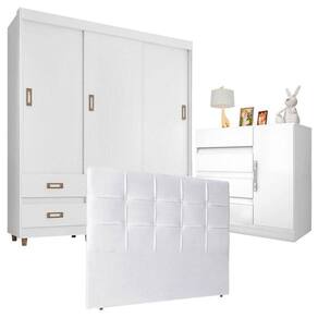 Quarto de Casal Guarda Roupa 37020 e Cômoda Exellence 8000 com Cabeceira Luiza 140 cm Branco Araplac