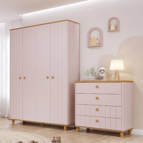 Transforme o cantinho do seu filho com o Quarto de Infantil Completo Guarda Roupa 4 Portas e Cômoda 4 Gavetas 100 MDF Lívia Permobili. O Guarda-Roupa Infantil Lívia 4 Portas é perfeito para crianças e pais que buscam qualidade e praticidade. Com quatro portas e três gavetas, oferece amplo espaço para roupas, brinquedos e acessórios. Suas dobradiças metálicas e corrediças telescópicas garantem durabilidade e suavidade. Cada gaveta suporta até 3 kg, tornando-o a escolha ideal para um quarto confortável e elegante. A Cômoda Infantil Lívia 4 Gavetas é perfeita para encantar o quarto do seu pequeno. Feita em MDF com pintura UV, ela é durável e charmosa. Suas quatro gavetas espaçosas com corrediças telescópicas facilitam a organização. Os puxadores de madeira maciça e os cantos arredondados, assim como os pés torneados, agregam delicadeza e estabilidade. Cada gaveta suporta até 3 kg, ideal para roupas, brinquedos e mais.