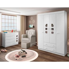 Conteúdo da Embalagem: 1 Cômoda, 1 Guarda Roupa, 1 Poltrona com Puff.