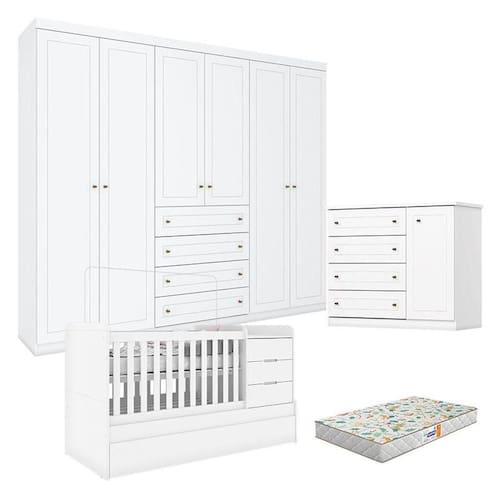 Quarto Infantil 6 Portas Americano com Berço Multifuncional Cleo Branco Fosco e Colchão Gazin - Henn