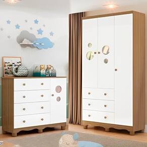 O quarto infantil Bolinha é o produto perfeito para o quarto dos pequenos! O Guarda-Roupa, com 3 portas e 3 gavetas, e a Cômoda, com 1 porta e 4 gavetas, otimizam a organização do espaço, e os detalhes em PETG Cristal nas portas trazem um charme especial ao ambiente.