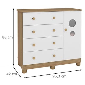 A Cômoda Bolinha 01 porta é um produto 100% MDF, sua pintura é atoxica, possui o tampo com bordas laqueadas, cabideiro metálico, puxadores plásticos, porta com PETG cristal, corrediças metálicas, pé plástico já incluso e 02 modelos de rodapé.