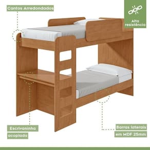 Com um design acolhedor e seguro, este beliche é o palco perfeito para sonhos incríveis. A escrivaninha de estudo acoplada é um cantinho especial para desenhar e aprender, enquanto a cômoda é uma verdadeira caixa de tesouros para guardar brinquedos e roupas. A mesa de cabeceira é ideal para o livro de histórias da boa noite e a lanterna mágica, e o guarda-roupa gigante acomoda todas as fantasias e roupas dos pequenos. Cada dia é uma nova aventura e cada noite é um sonho encantado!