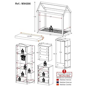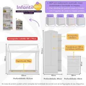 O Quarto Infantil com Cama Montessoriana e Colchão Incluso João e Maria Multimóveis MX4266 é a solução perfeita para criar um ambiente funcional, seguro e encantador no quarto das crianças. Produzido em MDP com acabamento acetinado (cerca de 20% de brilho), o conjunto combina qualidade, durabilidade e um toque de estilo. A cama infantil suporta até 70kg, com um encantador design em formato de casinha, que não só decora o ambiente, mas também incentiva a imaginação e a diversão das crianças. Seu formato facilita o acesso à cama, promovendo autonomia e conforto. Acompanha colchão D20 macio, tamanho 150x70cm, com tratamento antiácaro e antialérgico, proporcionando noites de sono mais tranquilas e saudáveis. O guarda-roupa possui 2 portas e 1 gaveta, com corrediças metálicas e puxadores em ABS, oferecendo praticidade e resistência. Suas prateleiras externas são perfeitas para organizar brinquedos ou exibir objetos decorativos, ajudando a manter o quarto organizado e charmoso. Acompanha também um cabideiro que suporta até 3kg, ideal para pendurar roupas e acessórios. A cômoda conta com 4 gavetas com corrediças metálicas e puxadores em ABS, oferecendo amplo espaço para organizar roupas e outros itens essenciais. Seu tampo suporta até 7kg, perfeito para pequenos objetos decorativos ou utilitários. Além de seu design encantador e funcional, o guarda-roupa e a cômoda são flex, com detalhes personalizáveis em 4 cores (branco, cinza, rosa e azul), permitindo que você escolha a opção que melhor combina com o estilo e a decoração do quarto. A cômoda e guarda-roupas possuem sistema antitombamento e cantos arredondados, garantindo segurança e proteção para os pequenos.