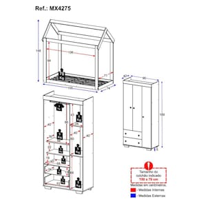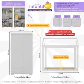 Dimensões do produto montado: Cama - Altura: 148cm | Largura: 155cm | Profundidade: 83,5cm Guarda-roupas - Altura: 189cm | Largura: 90cm | Profundidade: 42cm *Você pode consultar as medidas detalhadas na imagem técnica do produto.