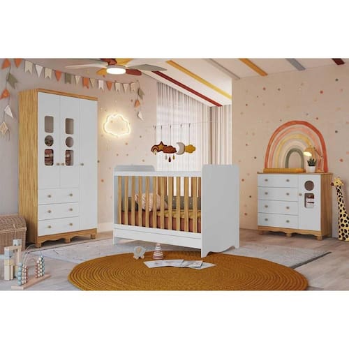 Quarto Infantil Completo 3 Peças (1GuardaRoupa+1Berço+1Cômoda) QI124 Branco/Amendoa - Peroba
