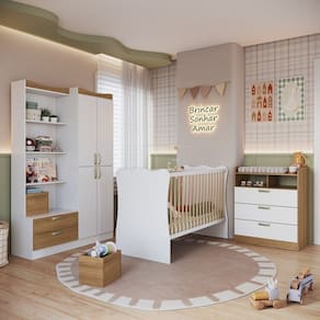 "O Quarto Infantil Completo da Plasmobile é produzido em MDP de 15mm proporcionando maior durabilidade e resistência. Com gavetas, cabideiro e prateleiras, o guarda-roupas e cômoda são muito funcionais para manter o ambiente organizado. O Berço com seus com cantos arredondados garante mais segurança e conforto (tamanho do colchão 1,30 x 0,60), possui 2 regulagens de altura para o colchão e acompanha suporte para mosquiteiro, proporcionando noites mais tranquilas de sono para o bebê.