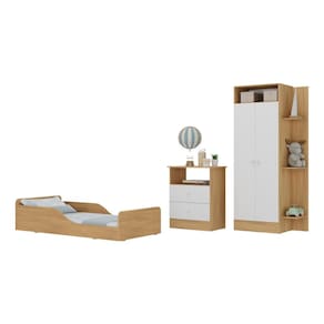 Diferenciais que encantam: - Design completo e harmonioso: guarda-roupa, cômoda e cama infantil que se complementam perfeitamente, trazendo beleza e organização ao quarto. - Guarda-roupa e cômoda produzidos em madeira de reflorestamento (MDP): resistência, durabilidade e respeito ao meio ambiente. - Acabamento acetinado com cerca de 20% de brilho: toque sofisticado e facilidade na limpeza. - Guarda-roupa funcional: 2 portas, cabideiro em madeira revestido para roupas longas e curtas, além de prateleiras externas para brinquedos ou decoração. - Cômoda versátil: possui nicho externo e 2 gavetas com corrediças metálicas, que deslizam suavemente. - Puxadores redondos em ABS: charme e delicadeza no ambiente. - Cama montessoriana 100% em MDF: suporta até 50kg, possui cantos arredondados e barras laterais com recuo, estimulando a autonomia do seu filho com segurança. - Colchão não incluso (tamanho indicado: 150x70cm).