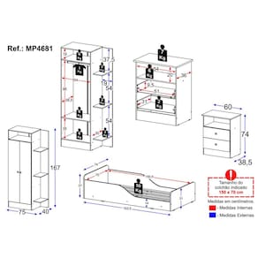 Dimensões do Produto Montado: Cama - Altura: 37cm | Largura: 153,5cm | Profundidade: 74cm Guarda-roupa - Altura: 167cm | Largura: 75cm | Profundidade: 40cm Cômoda - Altura: 74cm | Largura: 60cm | Profundidade: 38,5cm *Você pode consultar as medidas detalhadas na imagem técnica do produto.