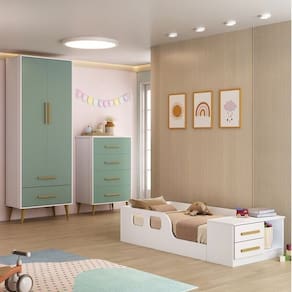 O Quarto Infantil Completo Magia é um conjunto encantador composto por um guarda-roupa, uma cômoda e uma cama montessoriana. Todos os móveis são construídos com materiais duráveis, apresentando uma estética sofisticada. O conjunto oferece um amplo espaço interno com detalhes cuidadosamente trabalhados, incluindo corrediças telescópicas suaves, puxadores elegantes e um interior moderno com uma pintura UV fosca. A montagem é simplificada com instruções detalhadas, e a embalagem garante a segurança das peças durante o transporte. Este conjunto transforma o quarto em um espaço magico de imaginação para as crianças. Possui Rodízio: Não Acompanha Colchão: Não Altura do Conjunto: 195 cm Ambiente: null Ambiente Principal: Quarto Infantil Cor: Branco/Verde Informação Complementar: 1x Guarda-roupa Infantil Encanto Branco/Verde Largura: 70,8 cm Altura: 195 cm Peso: 58,9 kg Profundidade: 40 cm Necessita Montagem: Sim