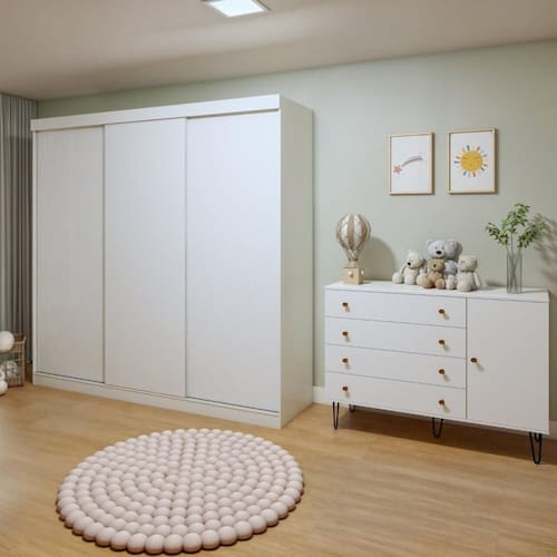 O Guarda-Roupa Thalia é a escolha ideal para quem busca praticidade e estilo. Com 3 portas de correr, o modelo permite otimizar o espaço do quarto, e a 1 porta adicional e 4 gavetas da cômoda Aurora oferecem mais praticidade para organização. excelência para manter tudo arrumado e ao alcance das mãos, esse conjunto vai transformar o quarto da criança em um ambiente funcional e acolhedor. Esse guarda-roupa pode ser utilizado em quartos pequenos? Sim, as portas de correr são ideais para quem tem pouco espaço e precisa otimizar o ambiente. A cômoda é espaçosa para roupas e acessórios? Sim, a cômoda possui 4 gavetas que ajudam a manter o quarto da criança bem organizado.