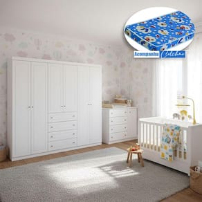 Quarto Infantil Mississipi 6 Portas Ambiente com Berço Tutto New Branco Fosco e Colchão Ortobom - Henn