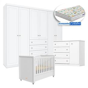 Quarto Infantil Mississipi 6 Portas com Berço Tutto New Branco Fosco e Colchão Gazin - Henn