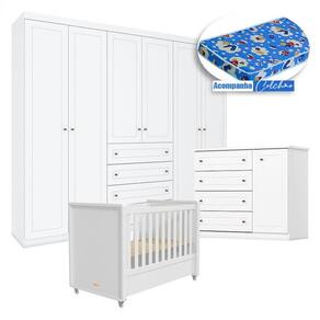 Quarto Infantil Mississpi 6 Portas com Berço Tutto New Branco Fosco e Colchão Ortobom - Henn