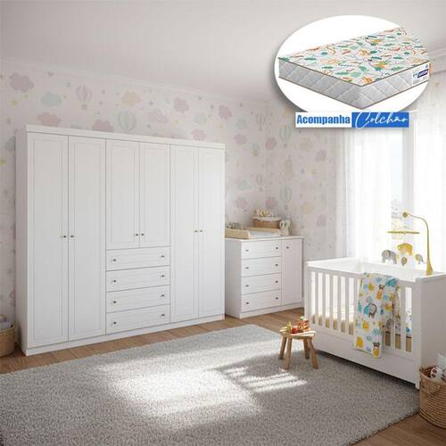 Quarto Infantil Mississipi 6 Portas Ambiente com Berço Tutto New Branco Fosco e Colchão Gazin - Henn