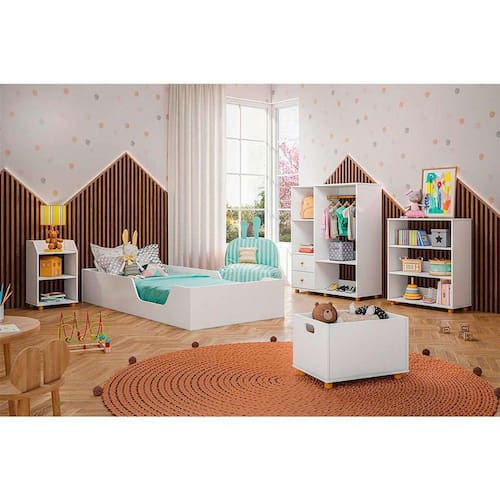 que tal o quarto infantil soneca? os móveis perfeitos para o cantinho do seu filho estão no quarto soneca! além de contar com uma ótima cama montessoriana para receber a criança e proporcionar um bom descanso depois de um dia de brincadeiras, o kit é composto por guarda-roupa, estante, baú e mesa de cabeceira para organizar roupas, calçados, brinquedos e itens decorativos. de visual neutro e sóbrio, as peças têm coloração clássica do universo infantil e são simples de combinar com a decoração escolhida para esse cômodo tão especial da casa. realmente completo, né? Marca: Modern