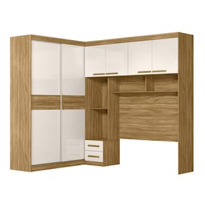 Características Estrutura em MDP. 04 Portas articuladas. 05 Gavetas com corrediças telescópicas. 02 Portas de correr com trilhos de alumínio. Prateleiras com amplo espaço. Cabideiros e calceiros em alumínio. Puxadores em MDF. Mesa de cabeceira embutida. Montagem flex, direita/esquerda. Apliques chanfrados. Nicho ideal para decoração. *Ideal para box 138 cm.