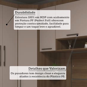 Caracteristicas: Estrutura: 100 MDP Acabamento: Perfect Foil -PF- Quantidade de Portas: 9 Tipo de Abertura das Portas: 7 de Bater e 2 Basculantes Quantidade de Gavetas: 6 Tipo de Corredicas: Telescopica Tipo de Cabideiros: 2 em Aluminio Tipo de Puxador: Plastico PS Tipo de Pes: Rodape Sistema de Montagem: Cavilhas, Parafusos e Minifix Garantia: 3 meses